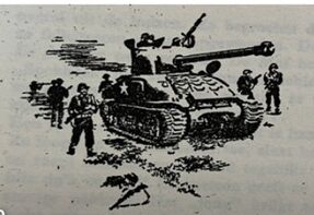 Dan ineens een geweerschot, vlakbij, Wat ratelt daar? Er komt iets aan. Een auto? … Een tank? … Het geratel wordt sterker. Daar, hoor, hoor, gejuich, ze komen, ze komen! We drukken onze hoofden tegen de kelderroosters, we kunnen slechts een klein gedeelte van de straat zien. Onze harten bonzen. Het geratel is nu vlakbij.
